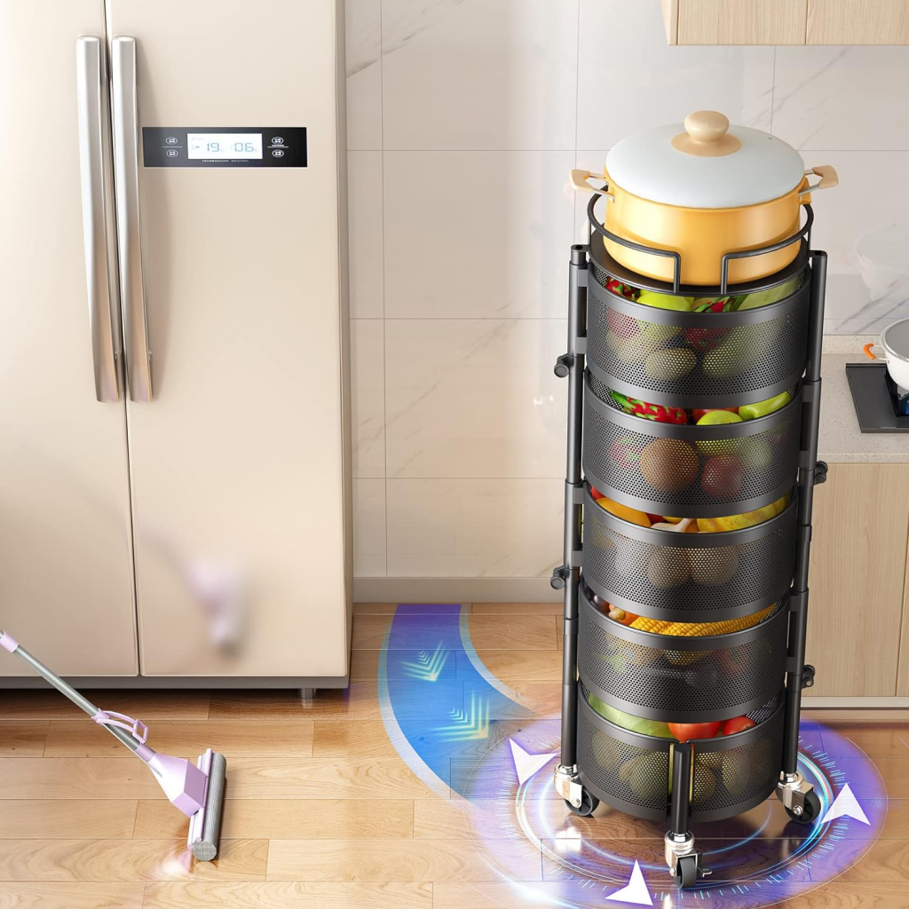 Introduce a touch of elegance and unmatched convenience to your kitchen with our 5-Tier Rotating Fruit and Vegetable Basket. Designed to cater to your storage needs while enhancing your kitchen decor, this versatile basket is the perfect solution for organizing fruits, vegetables, bread, and more. With its sleek black metal construction and innovative rotating feature, this basket rack is not just a storage solution but a statement piece for your kitchen.